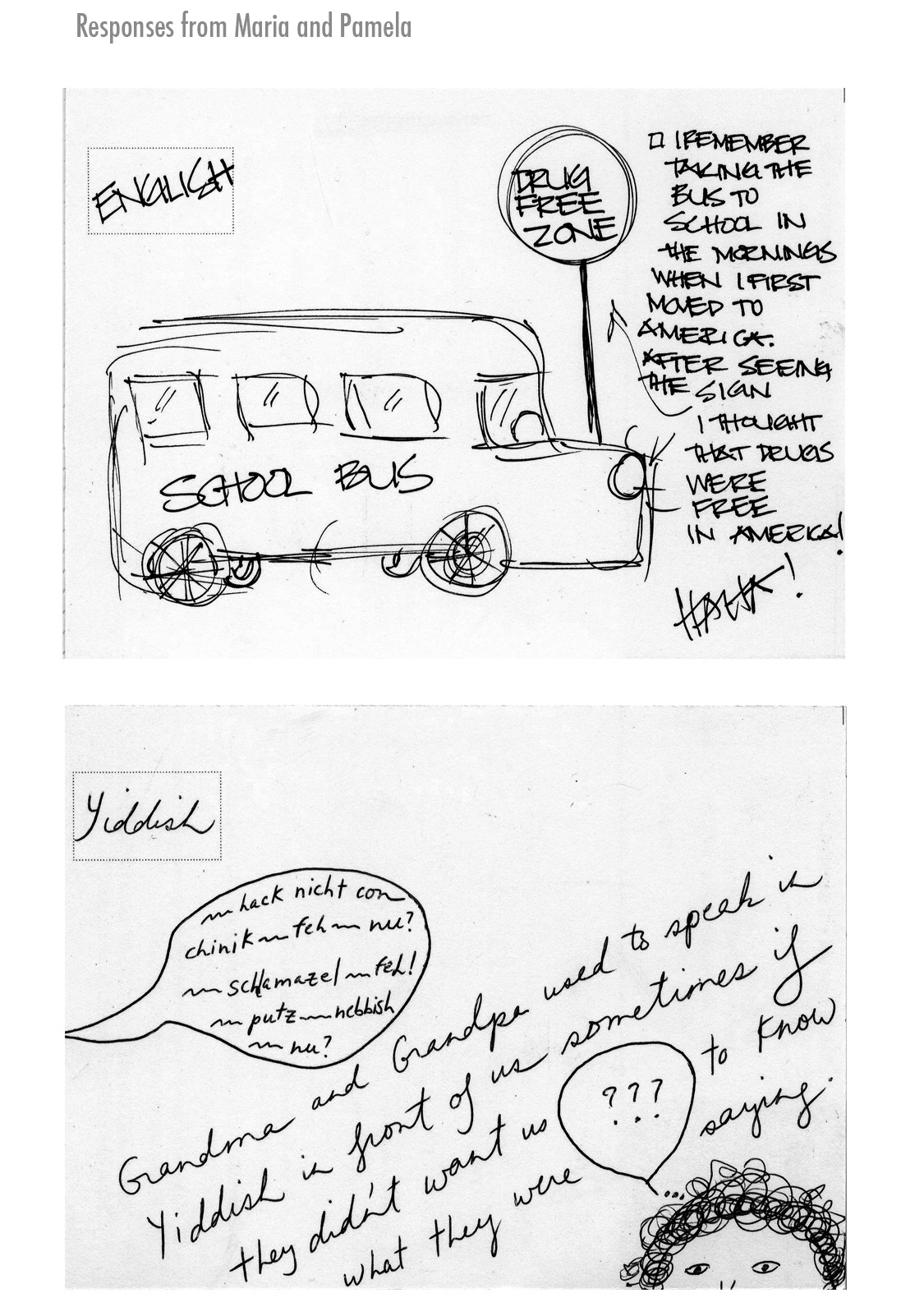 Experiment / Memory Cards: An experiment that consisted of a card (printed using the Risograph Duplicator) asking to share a childhood memory. Cards were distributed in Pratt West 18th studio + Telegraphe Cafe + Van Leeuwen Cafe. This project informed my Language + Creativity project.