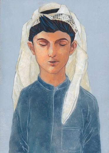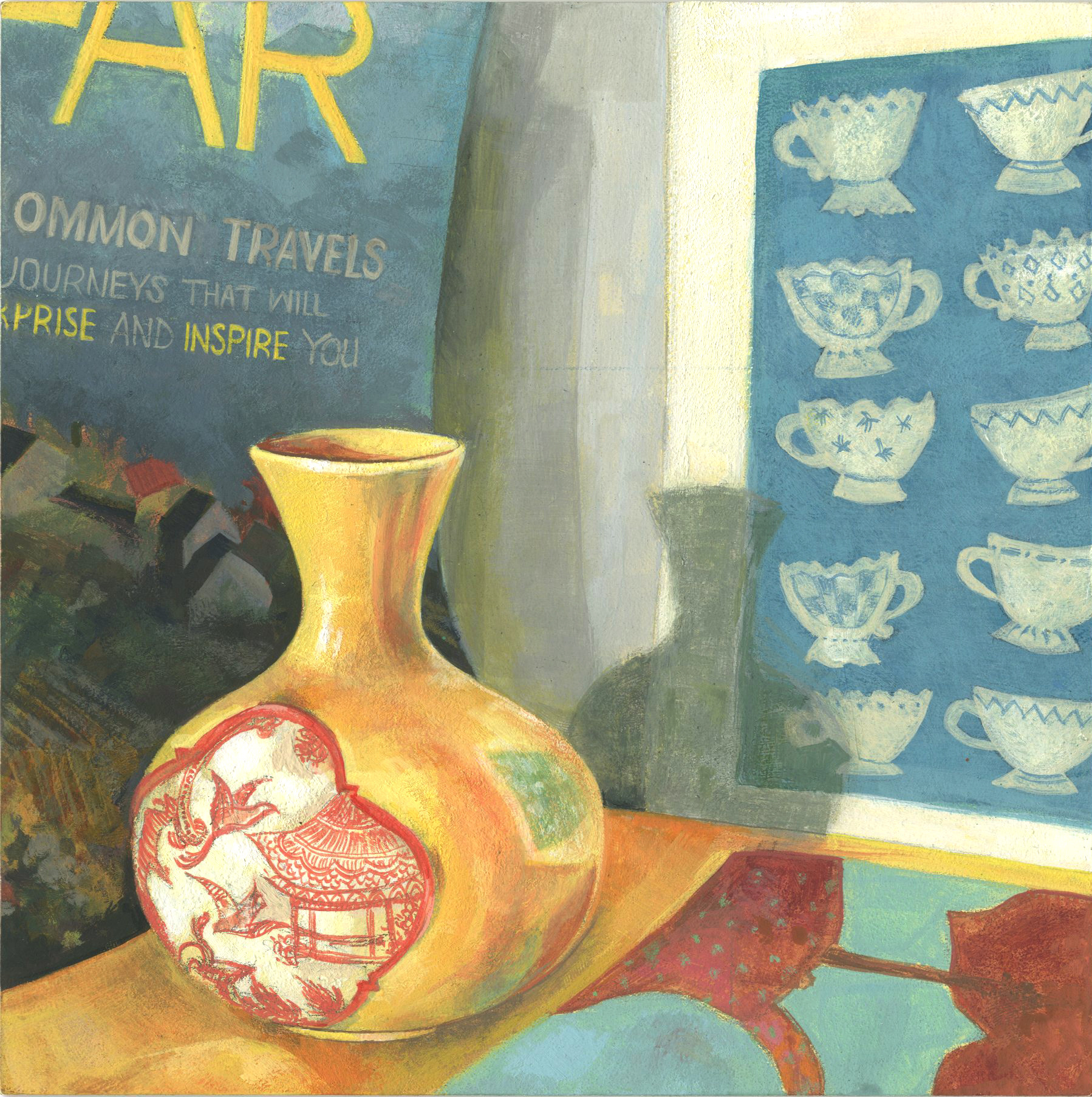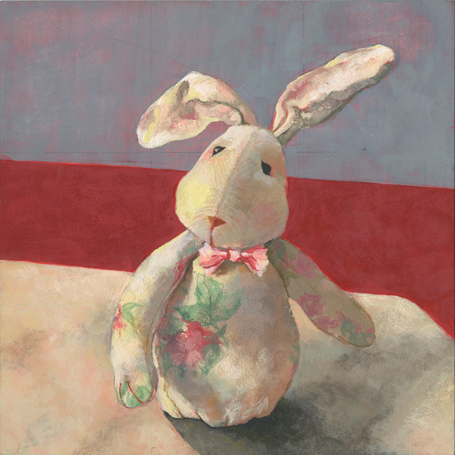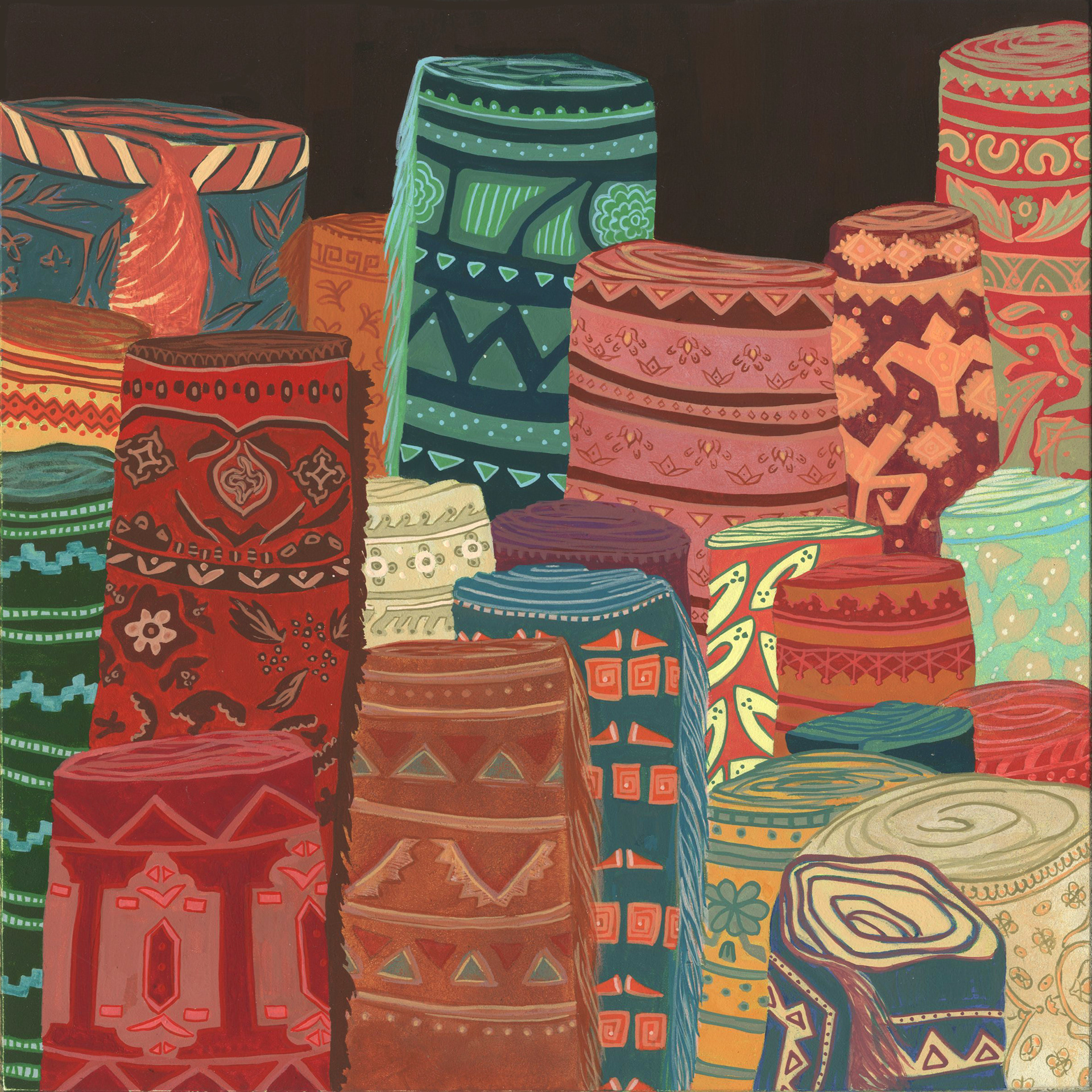 Gouache paintings of 1. Persian carpets, 2. Still life of vase, 3. Bunny, and 4. Portrait of Ghanim.
